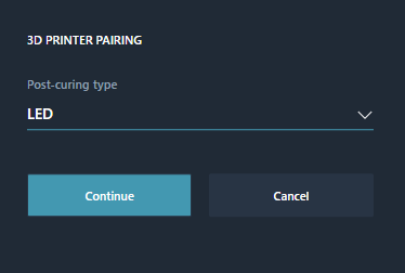 Once you have selected the post-exposure type and clicked “Continue”, a 6-digit code will appear at the top of the menu, which you must enter on your 3D printer.