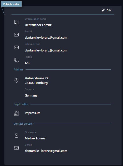 | Imprint | DentaMile connect allows you to delegate or receive cases delegated to you. Since this is a digital service, your partner must know which company they are dealing with before issuing the order. Therefore, you have the option of storing a legal notice (Imprint). |