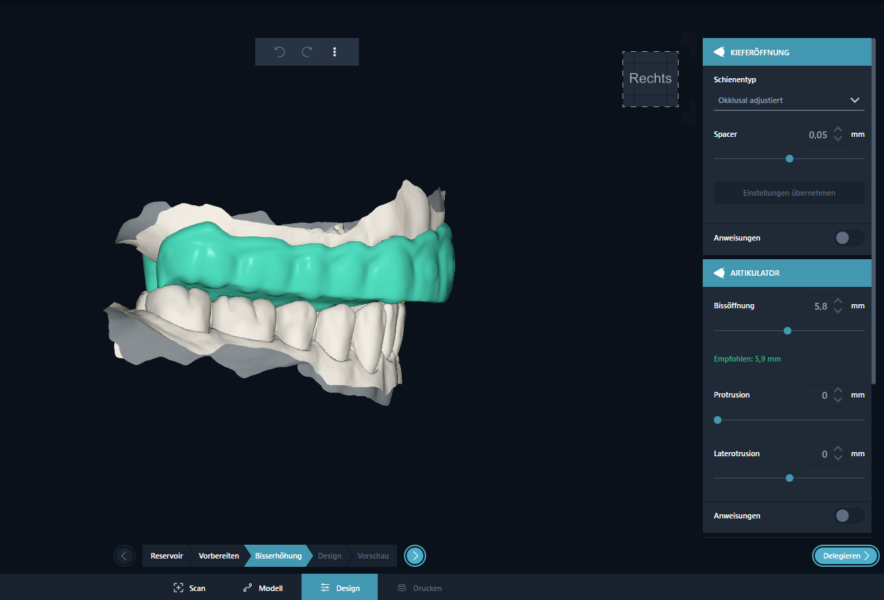 Der automatische Vorschlag für die Schiene wurde auf Basis des Bissöffnungswertes, den Sie im vorherigen Schritt festgelegt haben, berechnet. Sie können hier den Bissöffnungswert anpassen und einen neuen Vorschlag für die Schiene berechnen lassen.