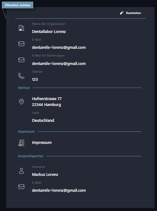 | Öffentlich sichtbar | Damit Sie Fälle von anderen Praxen und Laboren erhalten können, muss Ihr Unternehmensprofil auf “öffentlich sichtbar” gestellt werden. Die Standardeinstellung für Ihr Profil ist “öffentlich sichtbar”, kann aber hier umgeschaltet werden. |