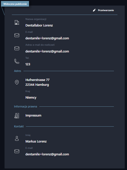 Widoczne publicznie: Profil firmowy musi być ustawiony na „widoczne publicznie”, aby uwzględnić przypadki z innych klinik i laboratoriów. Profil jest domyślnie widoczny publicznie, ale można to zmienić tutaj.