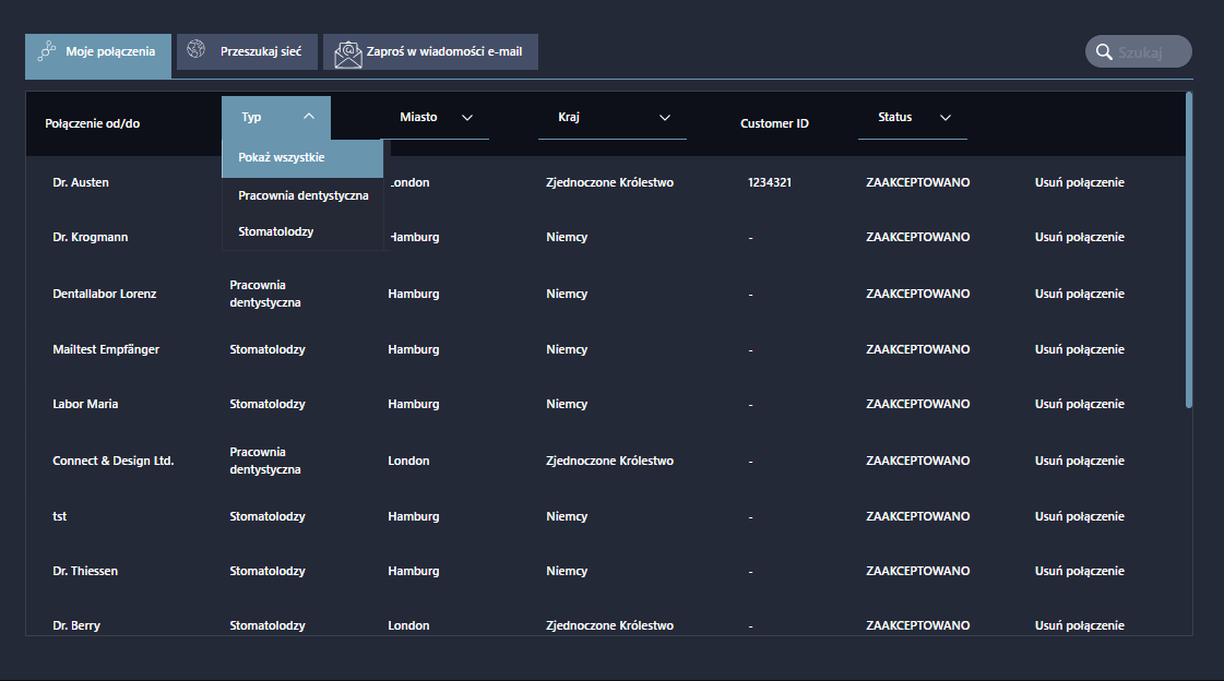 Aby połączyć się z organizacją, należy kliknąć przycisk „Dodaj połączenie” w prawej kolumnie. Administrator danej firmy otrzyma następnie wiadomość ze zgłoszeniem, które może zaakceptować (lub odrzucić). Jeśli połączenie zostało już nawiązane lub zgłoszenie oczekuje na decyzję, przycisk w ostatniej kolumnie nie będzie widoczny (e.g. dr Vulpur).