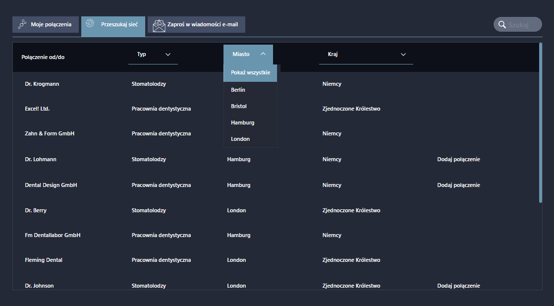 Użyj okna dialogowego przeszukiwania sieci, aby nawiązać nowe połączenia z organizacjami korzystającymi już z DentaMile. Należy pamiętać, że wyświetlane będą tu tylko organizacje z ustawieniem „widoczne publicznie” (Zobacz także Organizacja):