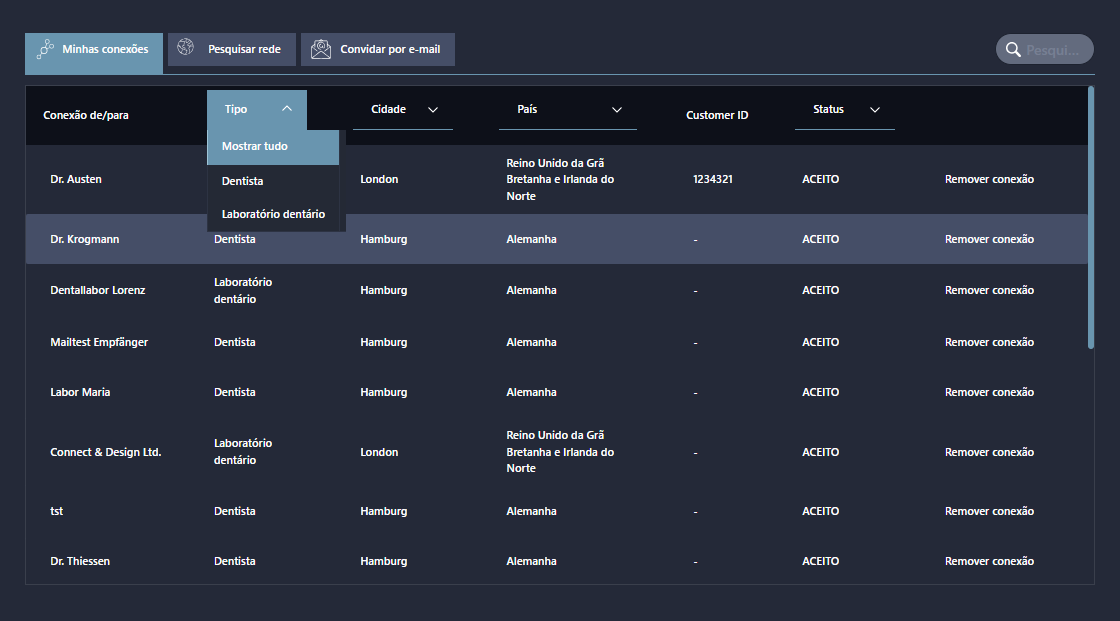 No DentaMile connect, “Conexões” significa o relacionamento com outras organizações (por exemplo, clínicas e laboratórios). Portanto, uma “Conexão” não é diferente de qualquer outra coisa na vida empresarial (por exemplo, XING, LinkedIn, Facebook).